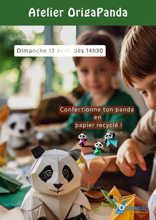 Dimanche 13 avril dès 14h30, nos p’tits cinéphiles pourront se transformer en artiste éco-responsable et donner vie à un adorable panda en papier recyclé lors de notre atelier créatif qui allie plaisir et respect de l’environnement !
