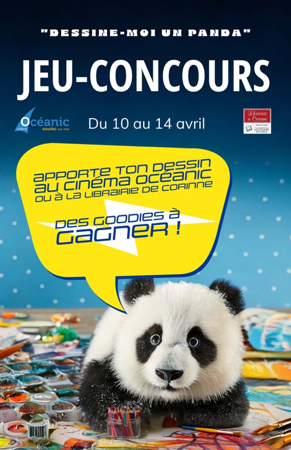 À l’occasion de la sortie nationale du nouveau film de Gilles de Maistre MOON LE PANDA au Cinéma Océanic samedi 12 à 18h00 et dimanche 13 avril à 15h00, retrouvez une mini-exposition dans le hall du cinéma et participez au jeu-concours «Dessine-moi un panda». (avec des goodies à gagner) !